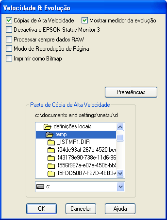 Pode aumentar a velocidade de impressão se efectuar determinadas definições na janela Velocidade & Evolução. Faça clique na tecla Velocidade & Evolução na janela Manutenção do controlador de impressão. Aparece o ecrã apresentado em seguida.