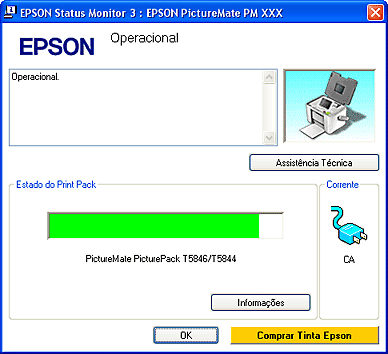 Se o tinteiro fotográfico instalado na impressora estiver danificado ou não estiver correctamente instalado, o EPSON StatusMonitor não apresentará o estado exacto do PicturePack. Substitua ou reinstale o tinteiro fotográfico.