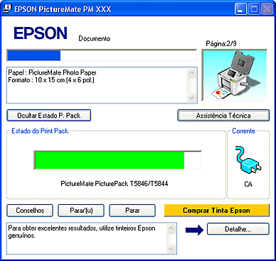 O medidor da evolução aparece automaticamente quando inicia uma tarefa de impressão. Pode verificar o estado do PicturePack a partir desta janela. Faça clique na tecla Ver Estado Print Pack que aparece no ecrã do medidor de evolução para poder ver o estado do tinteiro fotográfico da forma indicada.