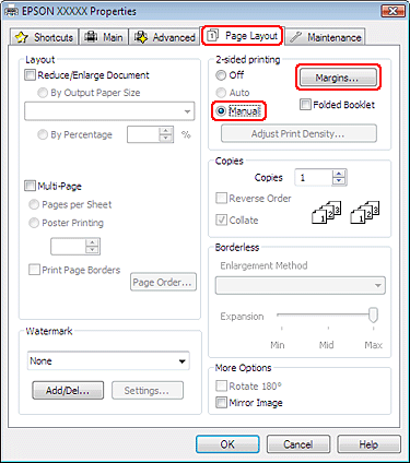 Faça clique no separador Page Layout (Esquema de Página) e seleccione Manual em 2-sided printing (Impressão dos 2 lados).