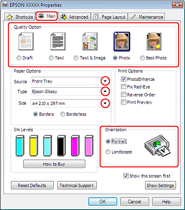 Faça clique no separador Main (Principal) e seleccione uma das seguintes definições para Quality Option (Qualidade):