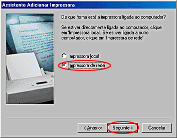 Seleccione Impressora de rede e, em seguida, faça clique em Seguinte.