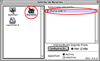 Seleccione Selector de Recursos a partir do menu da maçã e faça clique no ícone da impressora. Em seguida, seleccione a porta à qual a impressora está ligada.