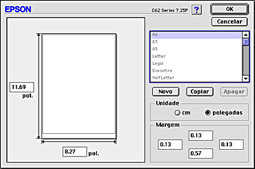 Para eliminar um formato de papel personalizado, faça clique em Personalizar na caixa de diálogo de definição de página, seleccione o formato na lista da caixa de diálogo do papel personalizado e faça clique em Apagar.