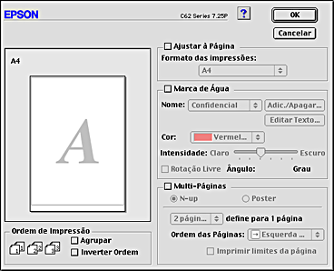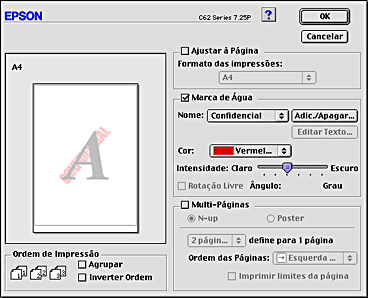 Seleccione a marca de água que pretende imprimir na lista Nome e, em seguida, especifique a sua posição, tamanho, cor e intensidade. Pode alterar a posição e o tamanho da marca de água, arrastando-a com o rato na janela de pré-visualização apresentada do lado esquerdo.