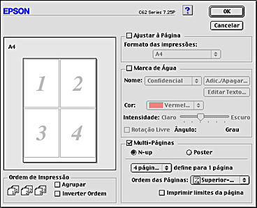 Seleccione N-up para a opção Multi-Páginas na caixa de diálogo Esquema, para imprimir duas ou quatro páginas do documento numa folha.