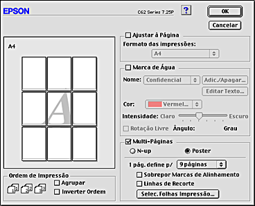 Pode ampliar uma página de forma a que ela ocupe 4, 9 ou 16 folhas de papel impressas. Seleccione Poster na opção Multi-páginas, para imprimir uma imagem em formato de poster.