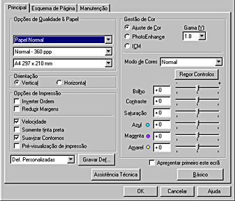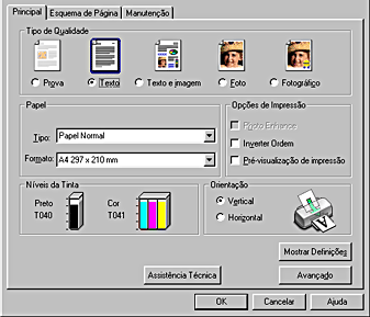 No menu Principal, pode seleccionar a qualidade de impressão, opções de papel e opções de impressão, definições avançadas e ainda verificar os níveis de tinta. Consulte a secção adequada.