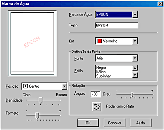 ![]() | Certifique-se de que seleccionou a marca de água adequada na lista de marcas de água e, em seguida, defina a cor, a posição, a densidade, o tamanho, o tipo de letra, o estilo e o ângulo (para mais informações, consulte a ajuda interactiva). As definições são aplicadas à amostra apresentada do lado esquerdo da caixa de diálogo. |