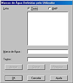 ![]() | Faça clique em Definições de Marcas de Água. Aparecerá a seguinte caixa de diálogo: |