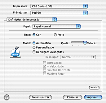 Quando selecciona o modo Automático na caixa de diálogo Imprimir, com a opção Definições de Impressão seleccionada, o software da impressora efectua todas as definições detalhadas com base nas definições de tipo de papel e tinta seleccionadas. Para definir a tinta, consulte Definir a tinta. Para definir o tipo de papel, consulte Definir o tipo de papel.