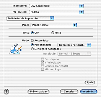 Ao seleccionar o modo Personalizado, activa a lista de definições personalizadas, onde pode seleccionar uma definição especialmente criada para imprimir texto e gráficos. Pode também seleccionar o método de correspondência de cores ColorSync. Pode ainda criar e guardar as suas definições personalizadas. Para mais informações sobre como efectuar definições personalizadas, consulte Utilizar o modo de definições avançadas.