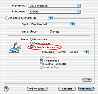 Este modo permite-lhe efectuar definições de impressão mais detalhadas. Para obter mais informações, consulte Utilizar o modo de definições avançadas. |