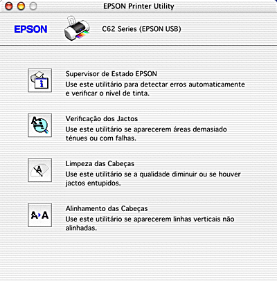 Para usar os utilitários, faça clique duas vezes no ícone EPSON Printer Utility na pasta Aplicações em Macintosh HD (predefinição) e, em seguida, faça clique na tecla correspondente ao utilitário que pretende utilizar.
