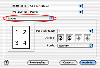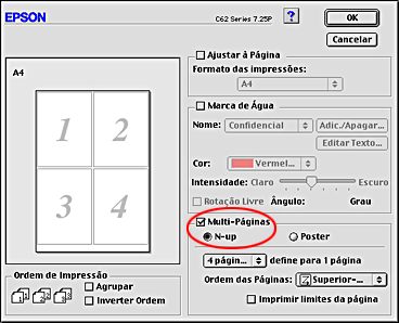 Em Macintosh, active a caixa de verificação Multi-Páginas situada na caixa de diálogo de esquema e, em seguida, seleccione N-up.