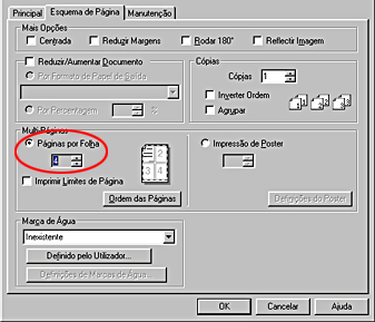 Imprime várias páginas do documento numa folha de papel. Pode seleccionar 1, 2, 4, 6, 9 ou 16. |