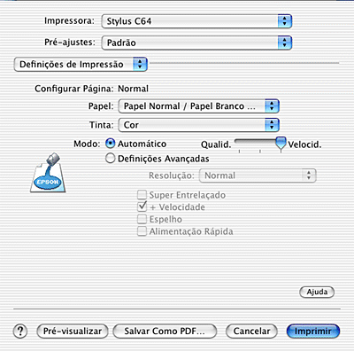 Este modo constitui a forma mais rápida e simples de começar a imprimir. O software da impressora efectua todas as definições detalhadas com base nas definições de papel e tinta seleccionadas.