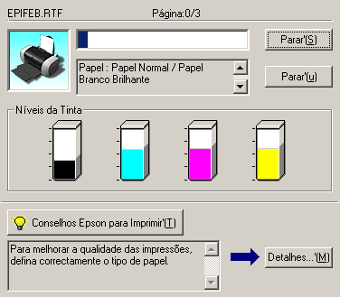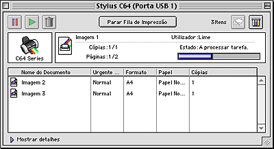 O Gestor EPSON é semelhante ao gestor de impressão do Windows. Se receber duas ou mais tarefas em simultâneo, o gestor armazena as tarefas por ordem de chegada (em impressoras de rede este procedimento denomina-se fila de impressão). Quando uma tarefa de impressão atingir o topo da fila de impressão, o Gestor EPSON envia a tarefa para a impressora. Pode cancelar tarefas de impressão a partir do gestor. Pode também visualizar informações de estado sobre as tarefas que enviou para a impressora, bem como parar, retomar e reiniciar tarefas de impressão seleccionadas.