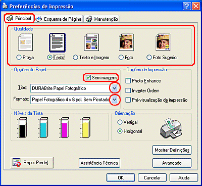 Depois de colocar papel na impressora, altere as definições do controlador de impressão para a opção de impressão sem margens.