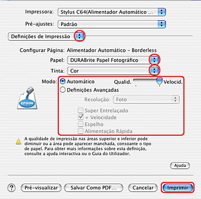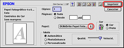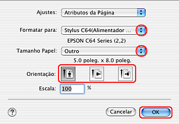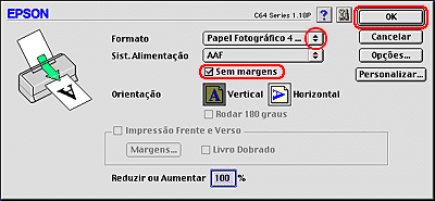 Seleccione Stylus C64 (Alimentador- Sem margens) para a definição Impressora.