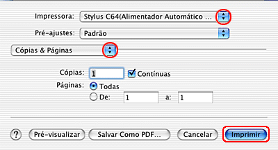 Seleccione Stylus C64 (Alimentador - Sem margens) para a definição de impressão e, em seguida, efectue as definições Cópias & Páginas.