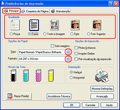 Faça clique no separador Principal e, em seguida, efectue a definição de opção de qualidade. Para mais informações sobre as definições de opção de qualidade, consulte a secção seguinte.