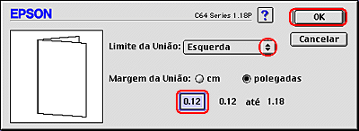 Seleccione a unidade de medida (cm ou polegadas). Especifique a largura da margem de união. Pode definir um valor compreendido entre 3 e 30 mm ou entre 0,12 e 1,18 polegadas. Essa largura de margem será utilizada em ambos os lados da dobra. Por exemplo, se especificar um valor de 10 mm, será inserida uma margem de 20 mm (10 mm de cada lado da dobra).