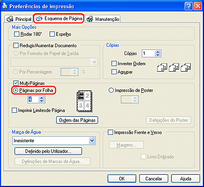 ![]() | Efectue as definições apresentadas em seguida para a impressão de páginas por folha. |