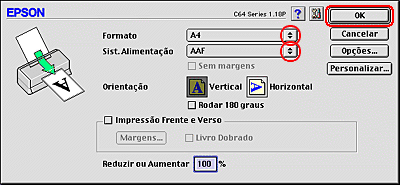 ![]() | Seleccione Stylus C64 para a definição Impressora. |