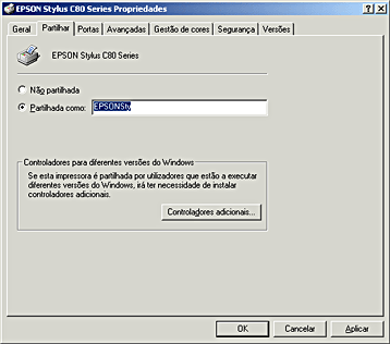 Seleccione Partilhado como (para utilizadores do Windows NT 4.0, seleccione a opção Partilhada) e, em seguida, escreva um nome para a impressora partilhada.