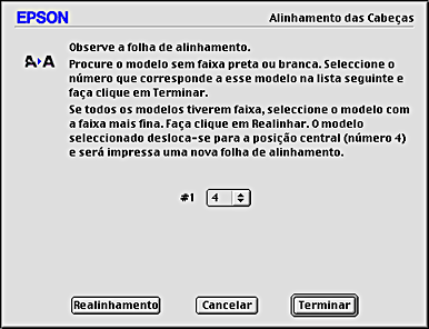 | Se não conseguir localizar uma linha alinhada correctamente, seleccione o número da linha mais correcta e faça clique em Realinhamento. As linhas seleccionadas serão repostas na posição central (número 8) e a folha de teste de alinhamento será impressa de novo. |