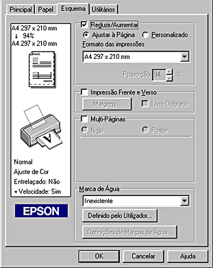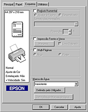 Pode efectuar as definições Reduzir/Aumentar, Multi-páginas e Marca de água no menu Esquema. Consulte a secção adequada.