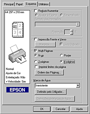 Seleccione N-up como definição multi-páginas no menu Esquema para imprimir duas ou quatro páginas do documento numa folha de papel.