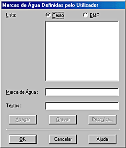 Pode também adicionar marcas de água com base no texto ou na imagem à lista Marca de água. Para adicionar uma marca de água, faça clique na tecla Adicionar/Apagar.... Aparece a caixa de diálogo seguinte.