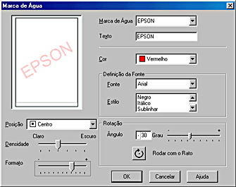Certifique-se de que seleccionou a marca de água adequada na caixa Marca de água e, em seguida, efectue as definições Cor, Posição, Densidade, Formato, Fonte, Estilo e Ângulo. (Para mais informações, consulte a ajuda interactiva.) As definições aparecem no visor do lado esquerdo da caixa de diálogo.
