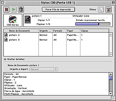 Depois de enviar uma tarefa de impressão para a impressora, pode utilizar o utilitário EPSON Monitor3 para verificar, cancelar ou alterar a prioridade das tarefas de impressão que estão na fila de espera. Este utilitário apresenta também o estado da tarefa de impressão em curso.