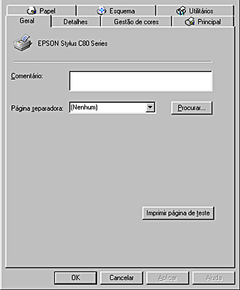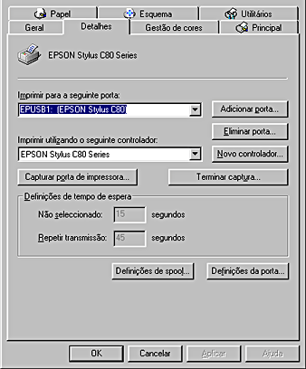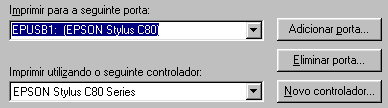 Se EPUSBx: (EPSON Stylus C80 ou EPSON Stylus C70) aparecer na caixa Imprimir para a seguinte porta, é porque o software da impressora e o controlador de impressão USB estão instalados correctamente. Se não aparecer a porta correcta, avance para o ponto seguinte.