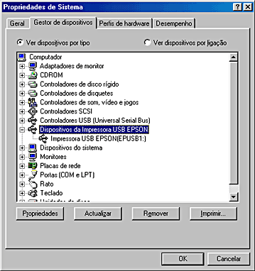 Se instalar correctamente os controladores, deve aparecer Impressoras USB EPSON no menu Gestor de Dispositivos.