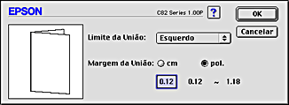 Especifique a largura da margem de encadernação na caixa de texto Margem da União. Pode especificar qualquer largura de 3 a 30 mm. A largura da margem especificada é utilizada em ambos os lados da dobra. Por exemplo, se especificar uma margem de 10 mm, será inserida uma margem de 20 mm (será colocada uma margem de 10 mm em cada lado da dobra).
