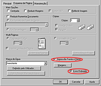 Seleccione a caixa de verificação Impressão Frente e Verso no menu Esquema de Página (Windows) ou na caixa de diálogo Definir Página (Macintosh). Seleccione a caixa de verificação Livro Dobrado.