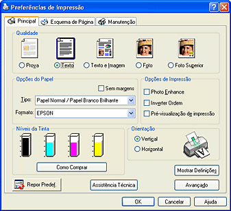 Faça clique em Gravar e, em seguida, faça clique em OK para regressar ao menu Principal. O novo nome do formato de papel personalizado aparece como definição de formato.