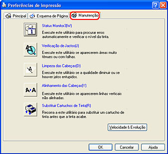 Para executar os utilitários, faça clique no separador Manutenção no software da impressora e, em seguida, faça clique na tecla correspondente ao utilitário que pretende utilizar. Para saber como aceder ao software da impressora, consulte a secção apresentada em seguida.