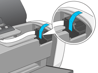 ![]() | Volte a abrir a tampa da impressora. Fixe o suporte dos tinteiros à impressora utilizando fita adesiva (conforme indica a figura) e, em seguida, feche a tampa da impressora. |