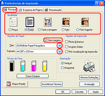 Depois de colocar papel na impressora, altere as definições do controlador de impressão para a opção de impressão sem margens.