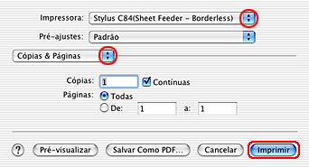 Seleccione Stylus C84 (Sheet Feeder - Borderless) para a definição de impressão e, em seguida, efectue as definições Cópias & Páginas.