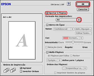 Pode imprimir com a funçãoAjustar à Página, quando pretender imprimir, por exemplo, um documento de formato A4 em papel de outro formato.