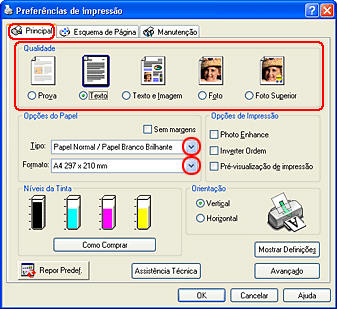 Faça clique no separador Principal e, em seguida, efectue a definição de qualidade. Para mais informações sobre as definições de qualidade, consulte a secção seguinte.
