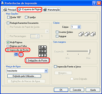 Faça clique no separador Esquema de Página, seleccione Multi-Páginas e, em seguida, seleccione Impressão de Poster. Faça clique na seta para cima ou para baixo para seleccionar 2x2, 3x3 ou 4x4.