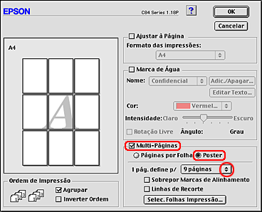 Esta opção permite imprimir as imagens com o formato de um poster aumentando uma página de forma a abranger várias folhas de papel.