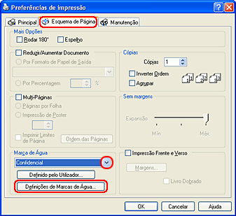 ![]() | Faça clique no separador Esquema de Página, seleccione a marca de água pretendida na lista Marca de Água e, em seguida, faça clique em Definições de Marcas de Água. |